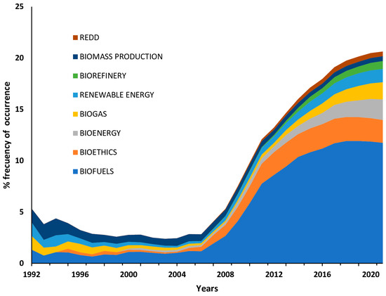 Figure 4 shows the frequency of the different keywords over time. Aspects related to “biomass” and its different variants and concepts such as “biodiversity” reflect permanent growth. Terms related to climate change factors, such as land use change, deforestation, and degradation, are another group of terms identified in the corpus. Keywords associated with renewable fuels reflect their growth in importance over the last 15 years. Finally, terms such as “sustainability” and “life cycle assessment” show less growth. However, these latter terms have a direct cross-cutting relationship with most of the topics analyzed and are fundamental concepts for compliance with Sustainable Development Goals.
