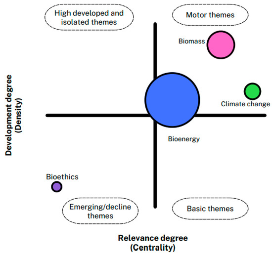 Figure 7 examines the evolution of the topic map of the main research directions in recent years. Among the motor themes, three basic directions can be observed: firstly, the growing importance of bioenergy as a general category, including biofuels and other types of renewable energy; secondly, biomass as a primary source for bioenergy production; and thirdly, climate change as a cross-cutting theme of the previous ones since it is directly related to the production of biofuels as a strategy to mitigate the climate impact of fossil fuels. No basic topics are reported in this period of the research.