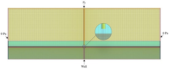 The form of the grid in Flow-3D is a structured finite difference grid. Unlike the common CFD grids, Flow-3D grids are less accurate in describing complex geometries and must be locally encrypted. The grid covers the whole model and is fully institutional, so it has high computational efficiency and the accumulated error values are small. In order to save computational time and to obtain the flow characteristics of a typical mid-section of an impinging jet, the model as a whole is meshed with a two-dimensional structured grid and the area between the outlet of the jet pipe and the impinging plane is encrypted. The grid size of the encrypted area is 5 mm × 5 mm, and the ratio of the size of the encrypted area to that of the ambient fluid grid cannot exceed 1:3 in order to ensure the computational quality, so the grid length of the ambient fluid is taken as 12 mm, and the boundary layer is encrypted. The upper boundary of the grid area is set as the velocity inlet, the direction is vertical downward, and the size is Vb (Vb is the average velocity of the section at the outlet of the jet pipe). The lower boundary is set as the wall boundary, and the fluid cannot cross this boundary. The left and right boundaries are set as the pressure boundary, the pressure on the specified boundary is 0 Pa and the water level is 180 mm.
