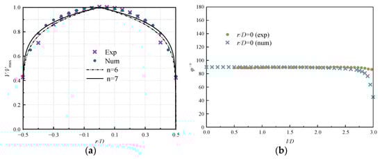 Figure 4a compares the calculated V/Vmax (Vmax is the maximum velocity at the exit of the jet pipe) curve with the empirical formula V/Vmax = (1–2r/D)1/n for the fully developed turbulent velocity distribution of the circular pipe and the results obtained from the model experiment. When n is 6 or 7, the empirical formula is considered to be approximately consistent with the fully developed turbulent velocity distribution of the circular pipe. As can be seen from the figure, the results of the submerged impinging jet applying the RNG k-ε turbulence model are in good agreement with the empirical formulation and the results of the model experiments, indicating not only that the flow at the jet outlet is a fully developed circular pipe turbulence, but also that the RNG k-ε turbulence model is suitable for the numerical simulation of the current model. Figure 4b shows the same corroboration of the above point, from which it can be seen that the numerical results of the axial flow angle of the jet are in good agreement with the experimental results, especially during the development of the jet. However, it is undeniable that there are still some differences between the two in the impact region. It can be noted that the fluid diffusion in the impact region in the experiments is small and the flow angle does not change much, while the results of numerical simulations show that the flow angle of the fluid in the jet decreases rapidly during the impingement process, but the trend of change remains consistent with the experimental results. Considering the accidental or systematic errors between numerical simulation and experiment, the experimental and numerical simulation results can be considered to be well matched.