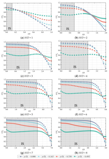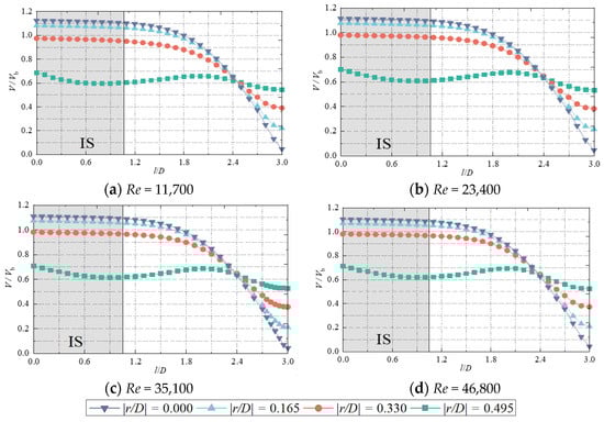 Figure 5 shows the axial distribution of the jet at different radial positions (r/D = 0, ±0.25 and ±0.5) V/Vb at different impinging distances for a Reynolds number Re of 23,400. As can be seen from the figure, regardless of the value of the impinging distance, at r/D = 0 (at the axis of the jet pipe), V/Vb first remains constant and then starts to fall, where this distance at which the velocity remains constant is called the length of potential core region Hp/D (Hp is the absolute length of the potential core region). The length of the potential core region Hp/D determined by the “95% guideline” [43]. That is, the axial length from the hole to the point where um decays to 0.95 uj (outlet velocity of the jet pipe). The figure shows that the length of the potential core region Hp/D and the distance from the end of the potential core region to the impinging plate (H/D-Hp/D) both increase with the increase of the impinging distance H/D. This is consistent with the conclusions drawn in the literature [44]. In the initial segment (IS), when r/D = ±0.5, V/Vb first decreases and then increases. The reason is that r/D = ± 0.5 of the radial position of the jet leaving the jet pipe first by the environmental fluid hindrance effect leads to a decrease in its velocity, and then, due to the jet boundary layer and the environmental fluid mixing with each other to promote the environmental fluid by the jet mainstream structure volume absorption and movement with the jet, an increase in the flow rate of the ambient jet results.
