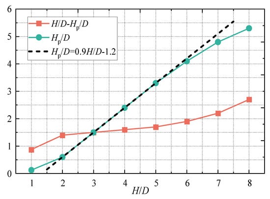 Figure 6 shows the variation of Hp/D and (H/D-Hp/D) with H/D. As can be seen from the figure, Hp/D is almost 0 when H/D is 1. This is caused by the limited space during the development of the jet, and the shear layer starts to decay rapidly before it touches the central potential nucleus region. When 2 ≤ H/D ≤ 5, both Hp/D and (H/D-Hp/D) increased linearly with the increase of H/D. When H/D exceeds 5, as H/D increases, the increment of Hp/D begins to decrease. The reason for this is that when the impinging distance increases to a certain value (H/D ≥ 5), the longer the impinging distance is, the longer the jet will be affected by the resistance produced by the ambient static fluid while it is developing. The jet can no longer continue to develop at the same speed.