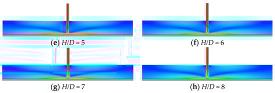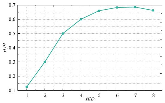 Figure 7 shows the variation of Hp/H with H/D. Hp/H dimensionless sizes the corresponding length and can better describe the relative length of the potential core region. As can be found from the figure, when 1 ≤ H/D ≤ 2, Hp/H increases rapidly. However, when H/D is gradually increased in the range of 4 to 7, the magnitude of the increase in Hp/H keeps decreasing, compared with H/D = 6, when H/D = 7, Hp/H only increased by about 0.44%. At H/D = 8, Hp/H starts to decrease compared to the former, it shows that under the condition of Re = 23,400, the relative length of the potential core region reaches the maximum value when H/D = 7. As a whole, when 5 ≤ H/D ≤ 8, Hp/H remains basically unchanged. The value can be taken as the average of Hp/H at 4 impinging distances, and is 0.673. Its maximum error with Hp/H at 4 impinging distances is only 3.94%.