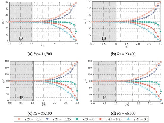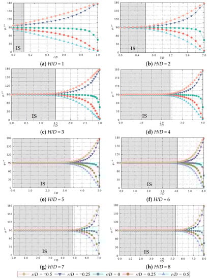 Figure 8 shows the distribution of the flow angle φ for different radial positions (r/D = 0, ±0.25 and ±0.5) of the jet at different impinging distances for Reynolds number Re = 23,400. The flow angle is defined as φ = arctan(−Vy/Vx), which can reflect the flow direction at any point in the jet. As can be seen from the figure, when r/D = 0, the φ at the end of the potential core zone is always around 90°. When the jet leaves the potential core zone, the size of φ on the axis (r/D = 0) starts to decrease gradually as the axial distance increases, the axial velocity on the axis starts to be smaller, and the circumferential velocity starts to increase, so the length of the potential core zone can also be defined as the length of the jet axis where φ remains around 90°. When r/D = ±0.5, with the increase of H/D, the range of φ at the end of the potential core region gradually approaches 90°. It shows that with the increase of H/D, the component of the water flow velocity at the end of the potential core region in the axial direction is gradually increasing.