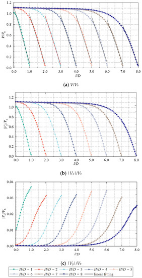 On observing Figure 9a, it is found that the abscissa of the intersection of the l/D-V/Vb curve and the abscissa axis of V/Vb = 0 at each impinging distance is the same as the impinging distance H/D. Then: