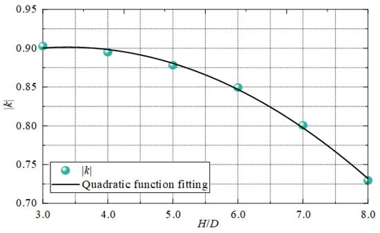 The linear function is shown in Figure 9a. The variation trend of V/Vb with l/D in the impinging region is basically consistent with the linear function. Comparing the slope of the linear function under each impinging distance in Table 1, it can be found that while H/D is increasing, |k| is decreasing. It shows that within a certain range, the increase of H/D can reduce the decay rate of V/Vb in the impinging region. After the impinging distance increases to 3, (ki+1−ki) gradually increases with the increase of the impinging distance. That is, the rate at which |k| decreases is gradually increasing. As shown in Figure 10, the |k| value shows an arc-like decrease. It was fitted using polynomials, and the second order polynomials fit the |k| values better. Its equation is as follows: