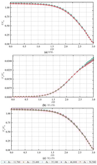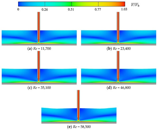 Figure 14 shows the distribution of the velocity magnitude V/Vb, horizontal velocity component |Vx|/Vb and vertical velocity component |Vy|/Vb along the jet axis at different Reynolds numbers. As can be found from the figure, when the Reynolds number is 11,700, the velocity along the jet axis in the initial section and transition section is slightly larger than the velocity in this range at other Reynolds numbers. The variation in Reynolds number in the impinging region has less effect on the magnitude of the velocity along the axis of the jet. The possible reason is that the low-velocity jet, when the Reynolds number is small, enters the static water body from the jet pipe. The resistance is less than the resistance of a high velocity flow with a higher Reynolds number. As a result, it has been able to maintain its original pace of development relatively well.
