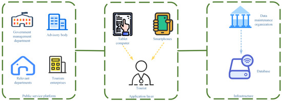 Smart tourism includes three levels: public service platform, application level and infrastructure. Public service platforms directly or indirectly provide services to tourists in the form of units or individuals, such as public management services, related services, consulting companies and tourism companies. Application level users are mainly travelers with Internet connection devices, including ultra-portable Internet terminals (such as tablets and smartphones). Infrastructure includes basic hardware, software and databases. On the basis of these hardware, there is a data center containing various travel information and a special organization responsible for managing and updating data [17]. The structure of smart tourism is displayed in Figure 1.