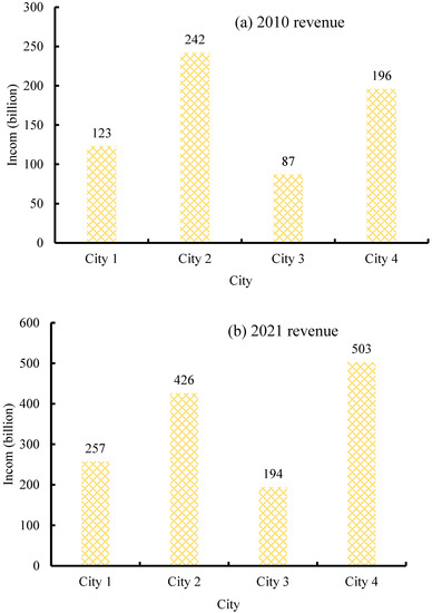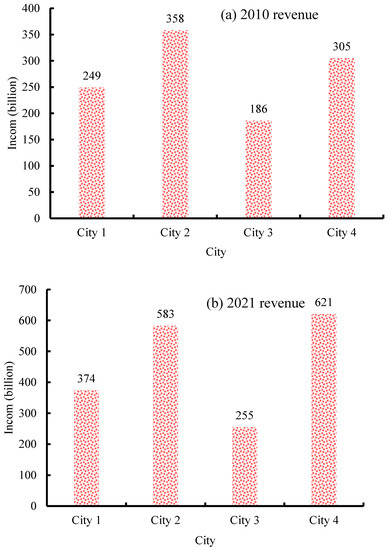 Figure 6a shows the FEI of the city’s tourism in 2010, and Figure 6b shows the FEI of the city’s tourism in 2021. For City 1, the FEI of tourism in 2010 was 12.3 billion yuan, and in 2021, the FEI of tourism would increase to 25.7 billion yuan. For City 2, in 2010, the FEI of tourism was 24.2 billion, and in 2021, the FEI of tourism increased to 42.6 billion. For City 3, the FEI of tourism in 2010 was 8.7 billion yuan, and the FEI of tourism in 2021 would increase to 19.4 billion yuan. For City 4, the foreign exchange revenue of the tourism industry was 19.6 billion in 2010 and it increased to 50.3 billion in 2021. Tourism of the four cities has been greatly improved as a whole. Compared with 2010, the tourism FEI of the four cities would increase by more than 70% in 2021.