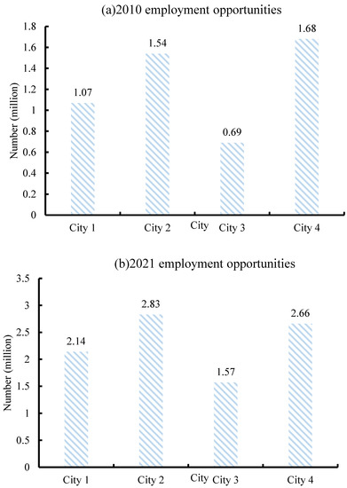 Figure 7a shows the urban tourism jobs in 2010, and Figure 7b shows the urban tourism jobs in 2021. In 2010, there were 1.07 million jobs in the tourism industry in City 1 and 1.54 million jobs in City 2. There are 690,000 tourism jobs in City 3 and 1,680,000 in City 4. By 2021, the number of tourism jobs in City 1 would increase to 2.14 million and that in City 2 would increase to 2.83 million. The number of tourism jobs in City 3 increased to 1.57 million and that in City 4 increased to 2.66 million. The city’s tourism has been driven up, and the tourism industry has gradually increased employment.