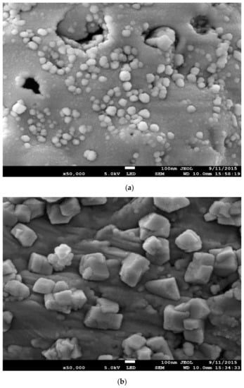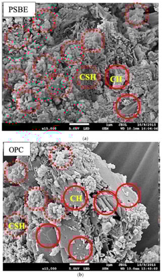 SEM of FC with PSBE and OPC. (a) FC with PSBE at 15,000× magnification, (b) FC with OPC at 15,000× magnification.