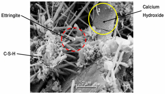 Microstructural analysis is a crucial factor in evaluating pozzolanic materials’ effectiveness in improving cement performance. This analysis confirms that the selected pozzolans can enhance the performance of cement through the pozzolanic reaction. The use of scanning electron microscopy (SEM) and energy dispersive X-ray spectroscopy (EDS) analysis enables the examination of the mineral phase changes and microstructure of hydration products, while X-ray diffraction (XRD) and differential thermal analysis (DTA) and thermogravimetric (TG) analysis provides data on the phase composition of hydration products. Figure 4 illustrates the SEM morphology of the hydration products of cement, which mainly comprises calcium silicate hydrate (CSH), calcium hydroxide (CH) or portlandite, and the hydration products of calcium aluminate (ettringite). Three distinct images characterize the morphology of the hydration products. Fibers or needles show an increase in the CSH gel, called honeycomb, which transforms into a closed-packed isometric grain. The CH appears in hexagonal crystals, while the ettringite are elongated crystals resembling needles [52]. Furthermore, Figure 5 shows the various forms of the hydration products of cement using SEM-EDS analysis. These findings demonstrate that using pozzolanic materials can lead to significant changes in the mineral phase and microstructure of the hydration products of cement. Based on the results, this study recommends that future studies explore the optimal dosage and type of pozzolanic materials for cement production. In addition, further research can investigate the influence of different pozzolanic materials on the mineral phase changes and microstructure of the hydration products of cement, particularly the impact on CSH gel formation. Furthermore, it is essential to investigate the durability of cement with pozzolanic materials, particularly in harsh environments, to ensure that it can withstand the test of time.