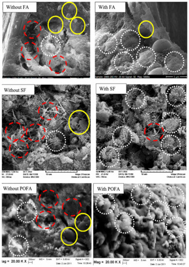As shown in Figure 6, the SEM morphology for the hydration products of FC, with the selected pozzolan, was examined. The specimen containing FA exhibited homogeneous foam bubbles with CSH gel located closely together. Conversely, the SEM image of the specimen without FA revealed more and larger pores, with more calcium hydroxide crystals that exhibited a large crystal structure and hexagonal prism [54]. A similar trend was observed in the specimen with nano SF, with the microstructure containing fewer microstructural pores than the specimen without SF due to increased calcium hydroxide crystals with a large crystal structure, and a hexagonal prism in the specimen without SF [55]. The microstructure of the specimen with POFA appeared to contain small pores, with the surface almost completely covered by CSH gel. The amount of CH was greater in the specimen without POFA [56], indicating that the incorporation of POFA and other PA as partial cement replacement in FC leads to densification of the concrete’s internal structure through pozzolanic reaction, resulting in a decrease in the quantity of CH crystal and an increase in additional CSH gel, ultimately leading to an increase in the strength of FC. In line with the microstructure, previous studies have also reported that the pore structure of cementitious material affects the strength and durability of concrete [57].