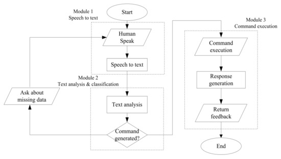 In this module, the person’s commands are converted from speech to text using the Google Speech to Text Cloud API. Google Speech to Text Cloud API transcribes the speech file using the most advanced deep learning neural network algorithms for automatic speech recognition (ASR) and returns the text statement [23]. Google Speech to Text Cloud API is one of the simplest methods for recognizing speech and can analyze up to 1 min of voice data.