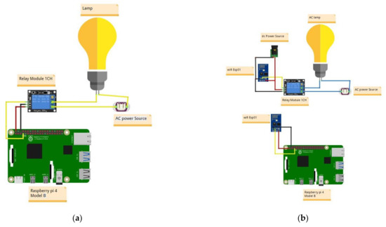 In this module, IRON executes the desired action via Raspberry Pi to turn on or off the dedicated device. The devices are connected to the Raspberry Pi according to their location from the main circuit. If the devices are close to the main circuit, they should be wired together; otherwise, they should be wirelessly connected using the Wi-Fi module ESP8266, as shown in the Figure 3a,b, respectively. When IRON sends an activated signal to a device, this signal is transmitted through the ESP8266 to turn on or off the relays which are connected to the device. The ESP8266 is selected as a communication module because it is a low-cost Wi-Fi microcontroller, and it supports both TCP/IP and Wi-Fi protocols. Furthermore, it covers a range of up to 400 m in the open air, but it can be reduced to a few meters when obstacles such as walls or furniture are present.