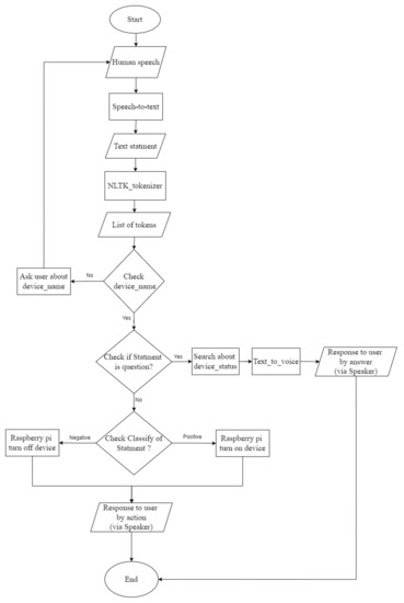 Furthermore, Kumer et al. [19] introduced a voice-based smart home automation system using IFTTT, Adafruit cloud, Ubidots IoT dashboard, and Google Assistant to efficiently control energy consumption. The voice commands are received by Google Assistant and sent to IFTTT. These commands are then sent to the microcontroller via Wi-Fi to turn the device on or off, according to the user’s command. The microcontroller updates the device status on the Ubidots dashboard, and feedback is sent to the user concerning this status. Putthapipat et al. [20] develop a home automation system based on the PiFrame framework. The system goal is to create an open platform for researchers to extend the features and develop their designs, similar to products such as Google Home and Amazon Alexa, but with more flexibility. The system hardware consists of a Raspberry Pi, a microphone, a speaker, and relays to control the home devices using voice commands. Google Speech API and Wit.ai are used to understand the user’s command and communicate with the home appliances. The system stores the home device’s current status on the Google Cloud Platform Cloud SQL through the Node.js application on Raspberry Pi. The response to the user is generated by translating the text to speech using Google Translate. Tiwari et al. [21] proposed a home assistant system that can be controlled and monitored using voice commands. In this system, the user can control the home devices and sensors from any cloud-connected platform through speech, text, or a mobile application. The system uses advanced speech recognition techniques, such as Mel-Frequency Cepstrum Coefficients (MFCC), with other features to create the feature vector. Vector Quantization (VQ) and Principal Component Analysis (PCA) are used for feature vector dimensional reduction and a Gaussian Mixture Model (GMM) to classify the speakers. The system uses cloud services IBM’s Bluemix and Google’s cloud service for speech-to-text conversion. Mehrabani et al. [22] presented a personalized speech recognition system using dynamic hierarchical language modeling for controlling customizable devices in smart home applications.