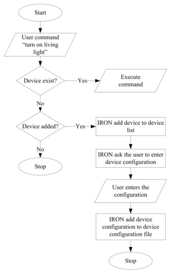 Over and above, IRON adds a feature for the user to add a new device via voice and configure it, as shown in Figure 5. First, the user connects the new device to the relay module unit. The user then asks IRON to turn on or off this new device. IRON checks whether this device is in the stored device list or not. If the device is not found in the devices list, IRON asks the user to confirm adding this device to the list. After that, IRON requests the device configuration from the user to add it to the file, as shown in Figure 6.