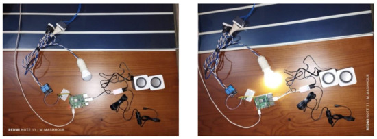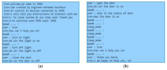 The proposed IRON system is practically implemented, as presented in Figure 7. The hardware system consists of a lamp device connected with a relay module to Raspberry Pi, as shown in the Figure 7. The relay module transfers the signal from the Raspberry Pi to the lamp device. When the user says “IRON”, the system is activated and gives instructions to guide the user on how to use IRON, as shown in Figure 8a. Afterward, the user starts to give the command to the system to control the device. If the user stops giving commands, the IRON goes into sleep mode and is deactivated until the user activates it again, as shown in Figure 8b. In the end, the user says, “Thank you”, to turn off IRON. Additionally, the time required to execute a command in IRON is empirically calculated to be approximately 30 s.