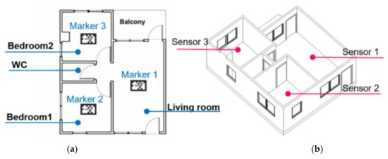 Home sensors distribution: (a) floor plan and markers location setup, (b) 3D BIM model.