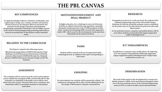 Project-Based Learning methodology assisted with Augmented Reality technology was designed using the PBL Canvas tool, and the diagram is shown in Figure 1. The PBL Canvas provided complete information about the project, thus, the participants were involved with a common communication framework during the implementation of the project. In this way, improvisations could be reduced and, consequently, both the time invested and the use of resources among all those involved in the project were optimized.