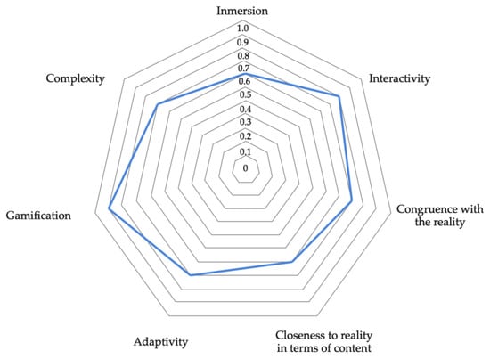 The Zappar application of the sample project has also been classified according to the evaluation criteria of AR-teaching-learning settings (AR-LLS) developed by Krug [49], in the context of education sustainability. We believe this evaluation is necessary to provide information about the characteristics of Augmented Reality which are responsible for the possitive effect on teaching-learning process within this work. In accordance with previous reports about Augmented Reality, conventional AR applications allowed to: “enrich the experiments”, “making visible the invisible” and “support paper-based learning”, as it occurred in this work. However, we considered that the use of the parameters of evaluation of AR-LLS allowed to relate them with the United Nation teaching learning scenarios which is neccesary to validate its contribution to the learning process. The parameters that have been evaluated in this study are: inmersion, interactivity, congruence with the reality, closeness to reality in terms of content, adaptivity, gamification and complexity. These parameters are represented in a heptagon and are qualified accordling to the percentage of the different characeristics of the sample project presented of the PBL assited with AR of this work (Figure 5).