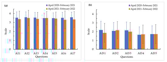 Table 6 presents the results for the Attention dimension questionnaire; the responses are grouped as increase (AI1 to AI7) or decrease (AD1 to AD5) of the criterium. Figure 6 shows the mean value for the responses that represent increase (a) and decrease (b) of the criterium. According to the students, between 80% and 96% of the students considered that the activities, materials, and organization of information used for Project-Based Learning assisted with Augmented Reality caught their attention and encouraged their interest to the fundamentals applied in the project. Barroso reported that the applications and development of AR tools attracts the attention of students [48]. Low mentioned a positive impression of the students with new, fun, and attractive of AR lessons, also remarking that visual aids for technical content provide benefits as extension of attention [26]. Bacca suggested that the learning experience of using AR technology captures interest, creates curiosity and helps students to focus in the fundamental information [56].