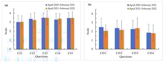 Students’ opinions on confidence are shown in Table 7; the responses indicate increase (CI1 to CI5) and decrease of confidence (CD1 to CD4). Figure 7 shows the mean value for the responses that represent increase (a) and decrease (b) of the criterium. Between 80.5% and 80.0% (CI1 and CI2) of students indicate they get confidence since the first impression concerning AR technology shown to be easy, and they understood the learning aim of the project. Similarly, 93.5%, 93.5% and 91.5% (CI3, CI4 and CI5) indicate that the organization of information and work in the activities allows to create confidence in learning and the capability for passing the final test. In general, students demonstrated confidence in their abilities and knowledge for participating in the Project-Based Learning assisted with Augmented Reality as academic strategy, in a way they understood the project aims and approved the final test with high scores. Low also reported the confidence of students who feel confidence to learn content with the use of AR technology [26]; however, when they were asked about confidence in taking a graded assessment the results diminished significantly. Bacca considers that AR tools supporting confidence in the students allow them to learn at their own pace and explore multiple possibilities for solving problems [56].