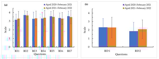 Responses about relevance are shown in Table 8; the responses for RI1 to RI7 indicate increase of this criterion, while responses for RD1 and RD2 correspond to decrease of perceived relevance. Figure 8 shows the mean value for the responses that represent increase (a) and decrease (b) of the criterium. Between 89% and 90.5% (RI1 and RI6) indicate that the content of the material was related to information they knew before. Similarly, students identified the activities and content as important (RI2, 99%, RI5, 91.5%), of interest (RI3, 86%) and useful (RI7, 93%). Regarding the use of AR as a technology tool, 85% (RI4) of students identified how the knowledge of AR is used as educational tool. The results show that the students perceived that Project-Based Learning assisted with Augmented Reality as relevant for their academic interest and their professional skills; similar results were reported by Low [26], who also mentioned that “these results were as the target group comprised of Chemical Engineering students with some background knowledge on the subject matter”. Laurens-Arredondo mentioned that students perceived that what they were learning through AR technology was useful in achieving this learning [54]. Additionally, Bacca reported that students perceived similar relevance for their learning process between AR learning experiences and traditional learning experiences [56].