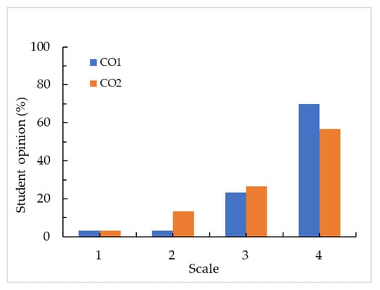 For the second academic year (April 2021 to February 2022), two additional questions were considered in the questionnaire, regarding the continuity between semesters. The responses are shown in Figure 10. 93.3% (CO1) of students believe their ability for using AR technology was improved. Furthermore, 83.4% (CO2) considered that AR technology help them develop the subject competencies. Anuar reported the increase of motivation from a moderate score level to a high score level in students of Basics of electricity and electronics after using AR teaching material [57].