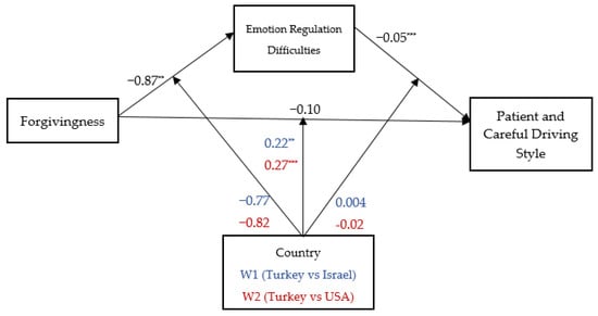 Moderated mediation model for the patient and careful driving style by forgivingness, emotion regulation difficulties, and country; ** p < 0.01, *** p < 0.001.