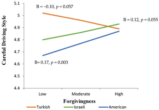 The results of the simple slope test revealed that even though Israeli and American drivers scored higher on forgivingness than Turkish drivers, among Turkish drivers, lower trait forgivingness was associated with greater adoption of the patient and careful driving style. Previous studies investigating differences in forgivingness in different cultures similarly found that trait forgivingness is higher in individualistic cultures than in collectivistic cultures [54]. This difference might be explained by the way people perceive forgivingness in different cultures. In individualistic cultures, the goal of forgivingness is personal well-being, whereas, in collectivistic cultures, it is social well-being [55]. In other words, in collectivistic cultures, forgivingness is motivated by a desire for social harmony and a reduction in conflict, rather than inner peace [56], making it a cultural norm rather than an individual trait. Therefore, even if trait forgivingness levels are low in collectivistic cultures such as Turkey, people might drive safely in order to maintain social harmony.