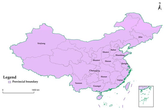 We obtained all data from official Chinese statistical documents [41,42,43,44,45]. Taking 2011–2020 as the research period, 13 provinces, including Shanxi, Xinjiang, Shandong, Shaanxi, Henan, Hebei, Fujian, Guangxi, Hunan, Jilin, Jiangsu, Yunnan, and Chongqing, were taken as the decision unit (Figure 2). Total fixed asset investment, the average annual number of employees, total electricity consumption, internal expenditure of R&D funds, and converted full-time equivalent of R&D personnel in the coal industry were used as input variables, representing capital, labor, resource, and technology factor inputs, respectively. Primary business income, coal production, and the number of smart unmanned work surfaces in the coal industry were chosen as the desired output variables and the mortality rate per one million tons and carbon emission in the coal industry were selected as the undesired output variables. For individual missing data, the interpolation method was utilized to supplement and improve.
