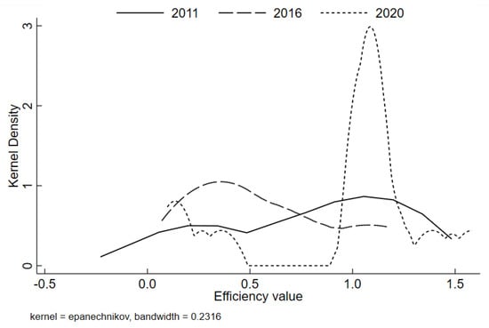 Based on the kernel density function, Stata 16.0 software was used to estimate the development efficiency of smart mine construction within the study area in 2011, 2016, and 2020 to visualize the spatial structure evolution characteristics of the development efficiency of smart mine construction (Figure 4). The results are displayed below.