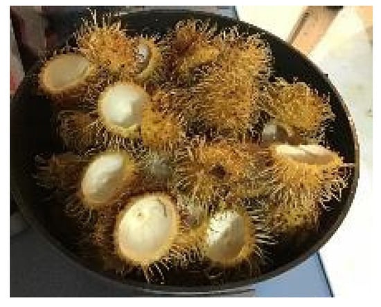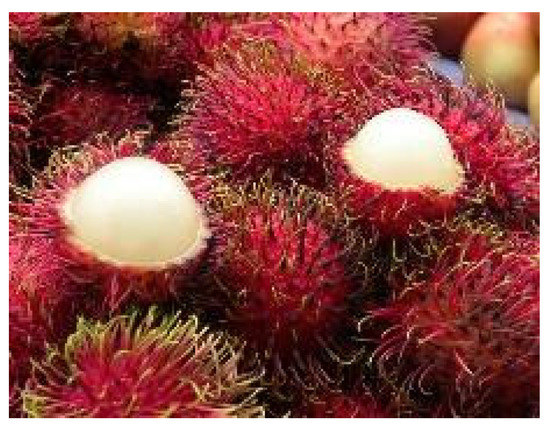 Nephelium lappaceum L. [1,2], better known as “rambutan” [3,4] or “Chinese mamon” (chino mamon) [5], is a fruit native to Indonesia [6]. This fruit is cultivated in South-East Asia, mainly in Indonesia, India, Finland, and Malaysia. The rambutan is a tropical fruit known for its sweet flavor, oval shape, juiciness, brown seed, white flesh, and softness [7]. The tree is about 12 to 20 m high, and its red or yellow skin is covered by soft thorns [8].