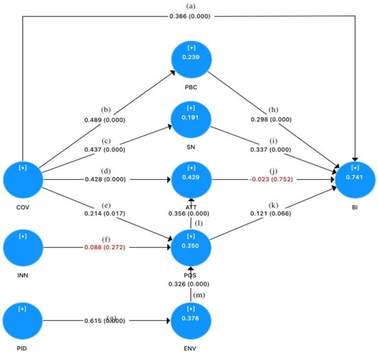 The next step in the analysis was to investigate the hypothesized relationships presented in Section 2. The hypotheses’ statistical significance was assessed using a bootstrapping technique with 4999 subsamples. Figure 2 depicts the findings of the standard estimate (β), while Table 6 summarizes in detail the bootstrap results of the structural model. Meanwhile, the mediation analysis results are presented in Table 7 and the model fit is presented in Table 8, respectively.
