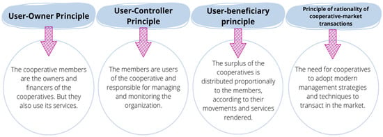 According to Valadares [17], there is a classical interpretation of the concept of cooperative, being that they are properties financed, controlled, and benefited by the users themselves, and act as financial intermediaries in economic transactions. This idea also addresses the behavioral and cultural dichotomy of cooperatives, encompassing four characteristic axes of the relationships of cooperatives with their members and of the cooperative with the markets, which Valadares [17] classifies as basic principles of cooperatives, as presented in Figure 1.