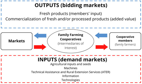 Economic relations of family farming cooperatives (outputs and inputs) (The arrows represent the flow of the relationship between the cooperative and the market and its members. The blue arrows represent the flow of outputs; the members deliver their products to their given cooperatives, and the cooperatives sell them in different markets. The red arrows represent the flow of acquisition of products, services, and information through the cooperatives that will be passed on to the members according to their needs). Source: Own elaboration, adapted from models by Schneider [26] and Valadares [17].