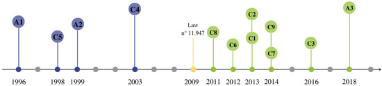 To facilitate the visualization of the constitution of all organizations covered in this study, a timeline was created, as shown in Figure 3. Blue represents the organizations created before 2009 and red represents those created after 2009, taking as reference the year in which Law 11947/2009 was enacted.