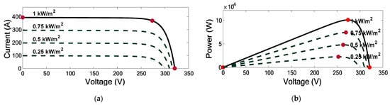 Equations (1) and (2) are used to determine the characteristic of the PV scheme during diverse irradiance circumstances. Figure 3 shows the characteristic of a PV scheme for nonlinearity and its dependence on solar irradiation. I-V curve shows a variable irradiance level starting from 0.25, 0.5, 0.75, 1 kW/m2 with short circuit current 400 A with an open circuit voltage 325 V the red circles in the figure illustrates the Isc, MPP, and Voc. However, the P-V curve demonstrates knee points for different irradiance levels that showing a relevant MPPs. Each curve has an MPPT at which the PV array gives the MPP.
