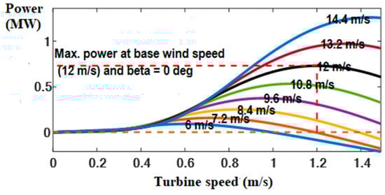 where , A, V, and Cp denote the air density (kg/m3), the swept area through the rotor blades, the air speed (m/s), and the power coefficient, respectively []. The WT can normally be characterized by its Cp–λ curve, where the λ denotes the tip-speed ratio. This can be determined by