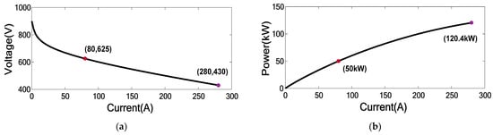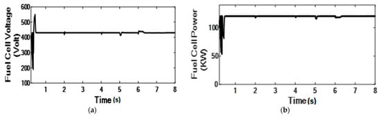 The performance of the PEMFC is determined by its output characteristics, which are nonlinear and are dependent on multiple parameters. These parameters are the cell temperature, oxygen partial pressure, hydrogen partial pressure, and membrane water content. The output of PEMFC is affected by changes in any of these parameters because of their direct effect on the electrical potential across the FC membrane. Figure 6 illustrates the V–I and P–I characteristics of a 120 kW PEM fuel cell.