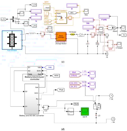 Simulink model of the proposed scheme: (a) wind turbine, (b) PV system, (c) PEMFC with electrolyzer, (d) battery system.