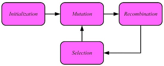 DE is an evolutionary stochastic population-based technique for continuous function optimization []. The general steps of an evolutionary algorithm are shown in Figure 8.