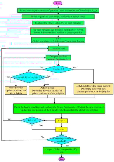 At the initial stage, Type A motion is more popular than Type B motion thanks to a time-controlled pseudocode (), which is employed to simulate the behavior of a jellyfish inside a swarm. Specifically, if is less than random (0, 1), then Type A motion is exhibited; otherwise, if is greater than random (0, 1), then Type B motion is exhibited. This is because the amount of over time climbs from zero toward one and thus increases the chances of an organism’s executing Type A movement. Nonetheless, as time passes, it can be seen that the more popular motion switches from Type A to Type B thanks to the aforementioned time discrepancy. All this information is depicted in Figure 9, which shows a flowchart for the JSO technique.