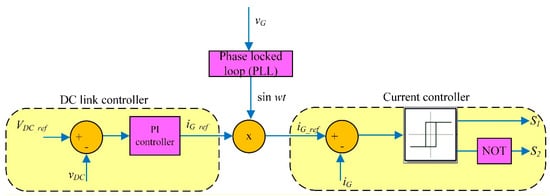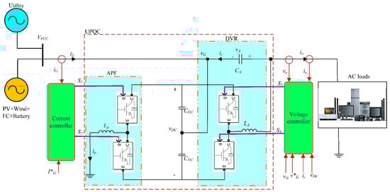 The detailed design of the proposed UPQC structure is shown in Figure 10. The UPQC is a full-bridge converter scheme consisting of two half-bridge bidirectional voltage-sourced converters (VSCs). One side contains a shunt active power filter (APF) to increase compensation for any harmonics or reactive currents. The other side has a series dynamic voltage restorer (DVR) connected to the other part of the converter.