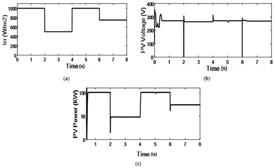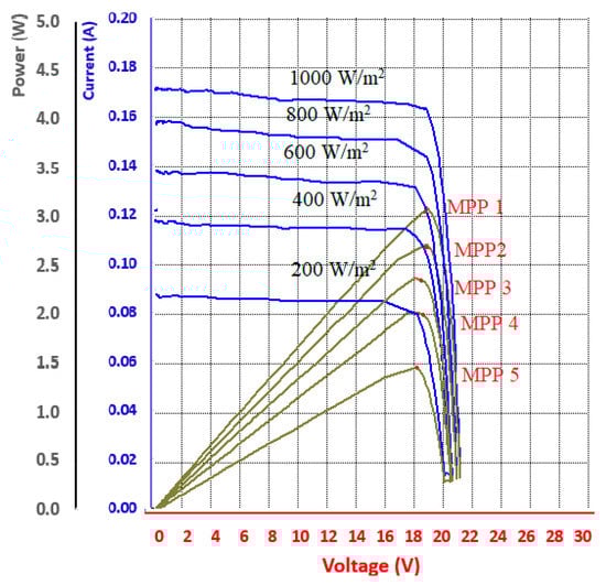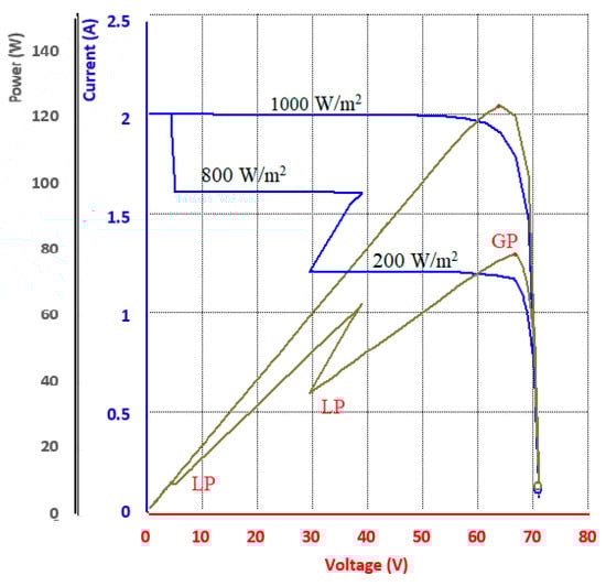 The MPP is verified by using the JSO when the irradiance suddenly descends from the full irradiation at 1000 W/m2 to 800 W/m2, 600 W/m2, 400 W/m2, and 200 W/m2, as illustrated in Figure 25. The impact of the irradiation and the corresponding I–V and P–V curve while applying the JSO technique shows that different MPPs refer to the variable irradiance.