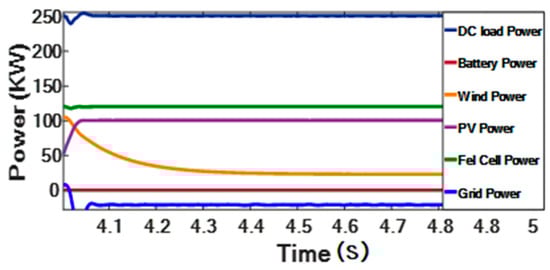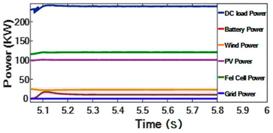 An overload happens between 0.21 and 0.31 s, causing the grid voltage to significantly fall, to 50% of its original magnitude. The UPQC promptly sees this sag mode and brings sufficient voltage to provide a steady and sinusoidal voltage. Ultimately, the DC link restores the energy that was pumped into the parallel converter. Figure 19 illustrates how power is consequently balanced across the grid for the subsequent compensation of the and the injection of the required output voltage for three-phase in red-yellow-blue colors.