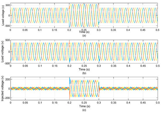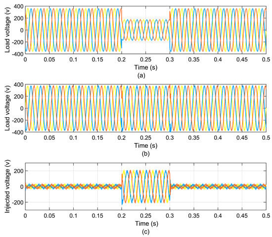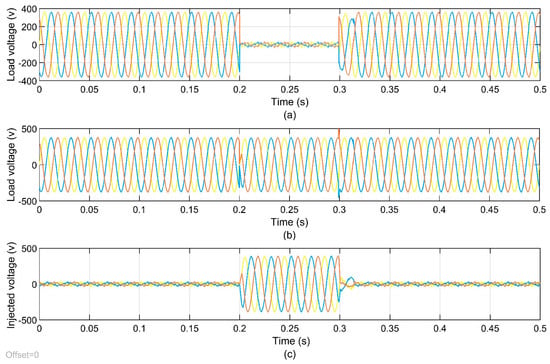 Voltage sag condition: (a) voltage during sag, (b) voltage after enhancement, and (c) voltage injection in volts.
