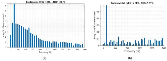 Total harmonic distortion (THD) is an essential factor when assessing the voltage or current signals of the distortion of the harmonic. Figure 22a,b illustrates the evaluated of the voltage before and after using a UPQC for checking its efficacy, respectively.