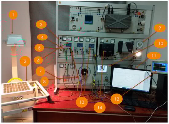 Experimental setup bench for the solar emulator: 1—dimmer for the altitude emulator; 2—polycrystalline solar emulator CO3208-1B; 3—solar module simulation CO3208-1A; 4—selector switch for varying the irradiance from 200 W/m2 to 400 W/m2, to 600 W/m2, to 800 W/m2, and to 1000 W/m2; 5—1 A-bypass diode; 6—DC ammeter and voltmeter for each module of the simulator; 7—ACCU 12 V-7 Ah battery; 8—1 kohm DC variable load; 9:12 V-LED lamp and halogen lamp; 10—Lucas–Nulle digital multimeter; 11—personal computer; 12—oscilloscope; 13—threefold 23 V/2A modules; 14—charger controller.